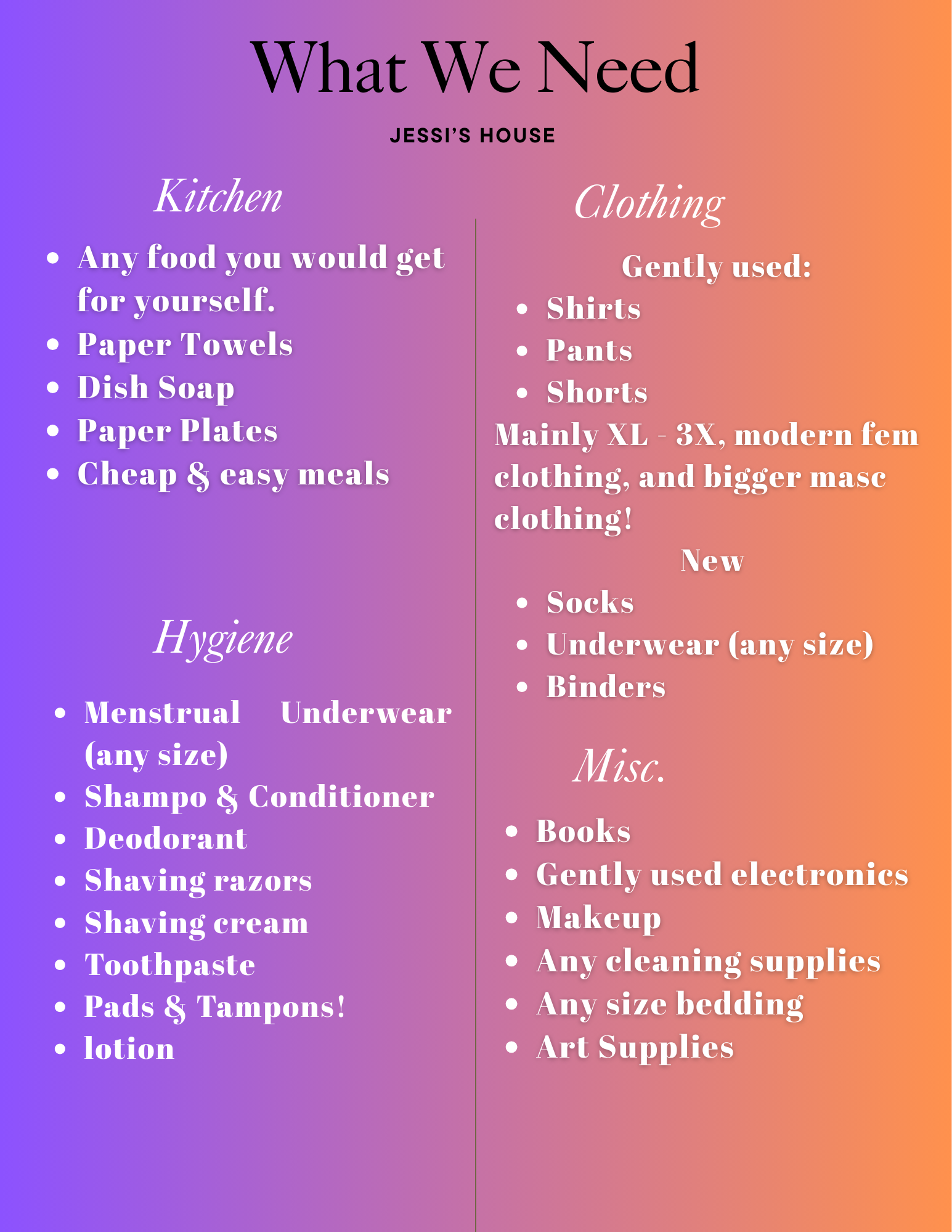To donate any of these things or more, get in contact with our donation’s coordinator, Nora!